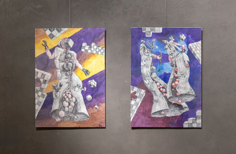 На виставці він показав сюрреалістичну графіку — дивний світ, заселений чудернацькими персонажами. Його роботи створюють особливий простір, де крихкість та беззахисність перетворюється на силу, а фантазія долає фізичні обмеження.