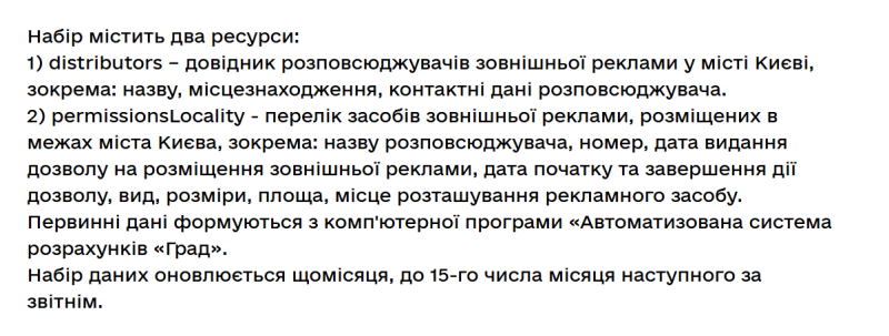 На Єдиному державному вебпорталі відкритих даних оприлюднено набір даних — «Інформація про рекламні засоби (дані про місце розміщення рекламного засобу, його вид і розміри, найменування розповсюджувача зовнішньої реклами, номер телефону розміщувача реклами, адреса електронної пошти, дата видачі дозволу та строк його дії, номер і дата укладення договору, якщо місце розміщення рекламного засобу належить до комунальної власності)».