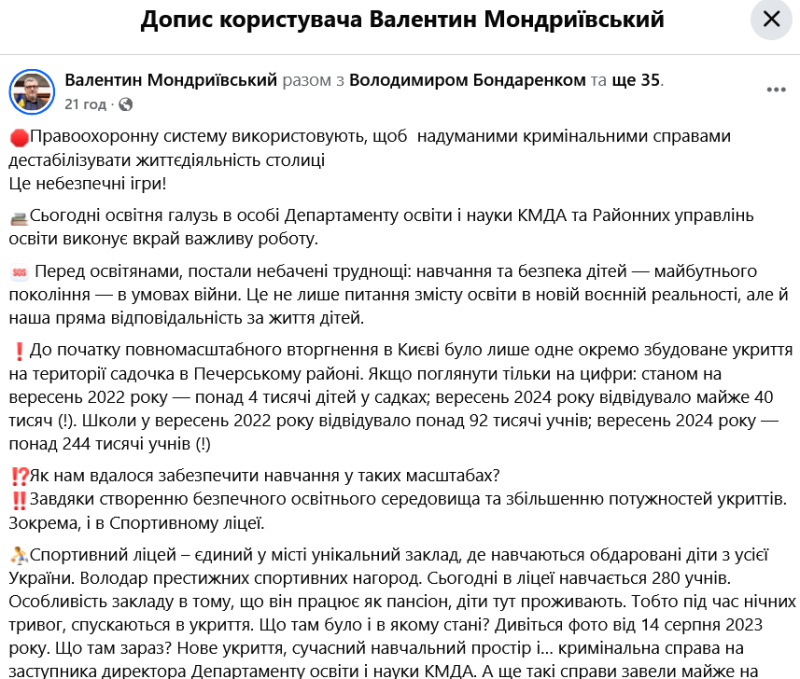 «Сьогодні перед нами, освітянами, постали небачені труднощі: навчання та безпека дітей в умовах повномасштабної війни. Це не лише питання змісту освіти в новій воєнній реальності, а й наша пряма відповідальність за життя дітей. До початку повномасштабного вторгнення в Києві було лише одне окремо збудоване укриття — в дитячому садочку Печерського району. У вересні 2022 року навчальні заклади відвідували понад 4 тисячі дошкільнят і понад 92 тисячі школярів. Через два роки їхня кількість помітно зросла: майже 40 тисяч дошкільнят і понад 244 тисячі школярів! Таких результатів ми досягли завдяки створенню безпечного освітнього середовища та збільшенню потужностей укриттів. Зокрема, у Київському спортивному ліцеї», — зазначив Валентин Мондриївський.
