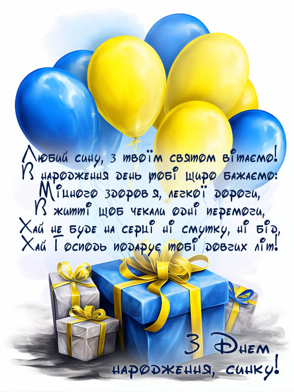 🎊 Мій найдорожчий сину, сьогодні особливий день – день, коли світ став кращим, бо в ньому з’явився ти. Я горджуся тобою, захоплююся твоєю добротою і силою. Нехай твоє життя буде сповнене радістю, щасливими моментами та світлом. Ніколи не забувай, що ти моя найбільша гордість і любов! 💙🎂