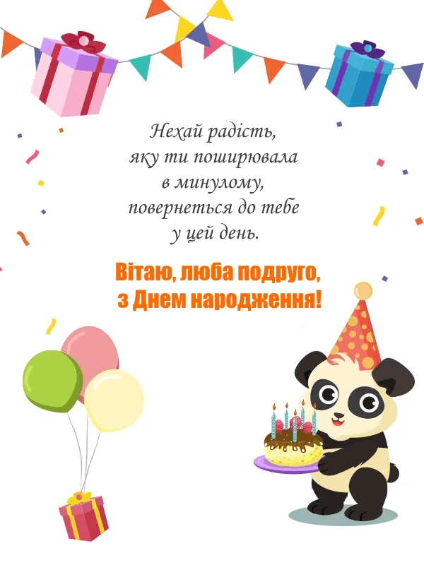 🎊 Дорога подруго, вітаю тебе! Бажаю, щоб у твоєму серці завжди жила радість, душа співала від щастя, а кожен день приносив лише позитив! Будь неймовірно щасливою! 💖🌸