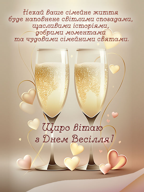 💖 Вітаю вас із найважливішим днем у вашому житті! Бажаю, щоб ваш шлюб був міцним, кохання – вічним, а щастя – безмежним. Нехай ваш дім буде сповнений тепла і затишку! 🎉🥂
