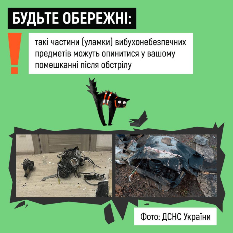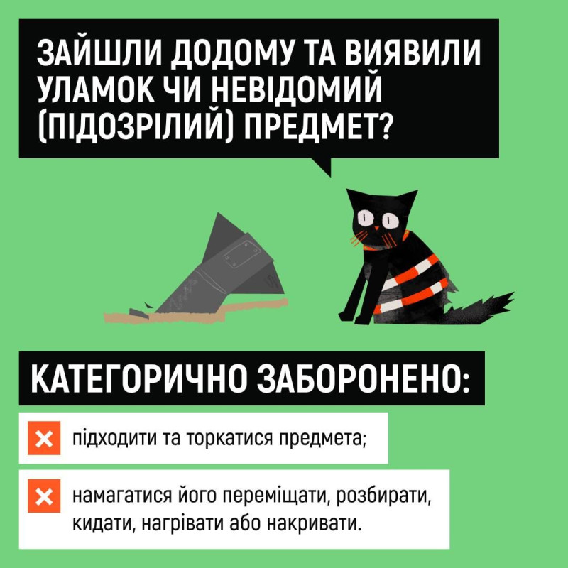 «Нехай ці знання вам ніколи не знадобляться, але ви маєте це знати! Гортайте картки, щоби знати, як правильно діяти в ситуації, якщо виявили вдома уламок чи підозрілий предмет», — зазначають у ДСНС.