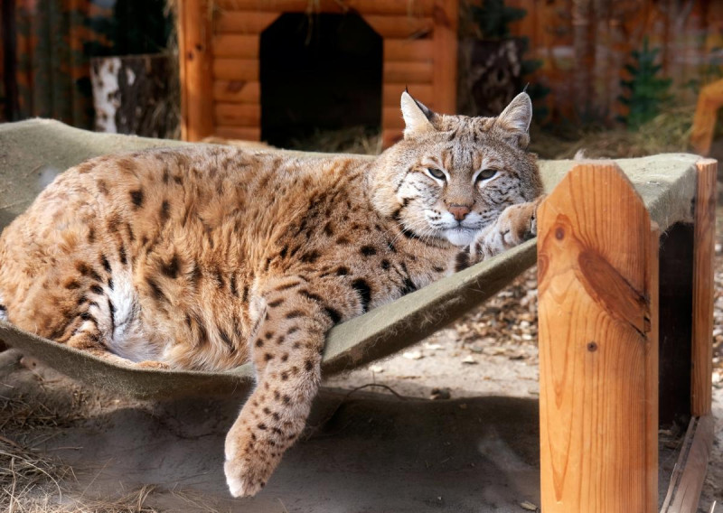 На фото можна побачити, як рись відпочиває на гамаку / фото Київський зоопарк