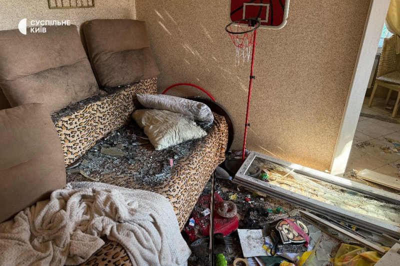 Диван, усіяний склом і землею, та потрощене вікно поруч. Буча, 8 серпня 2025 року. Суспільне Новини/Анна Железняк