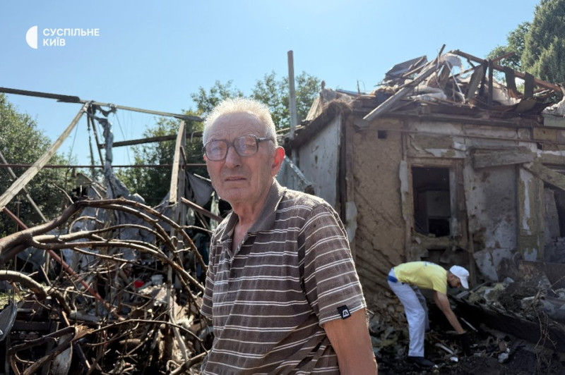 Юрій Бурковський біля свого поруйнованого внаслідок дронової атаки РФ будинку. Буча, 8 серпня 2025 року. Суспільне Новини/Анна Железняк