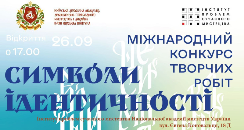 26 вересня у виставковому залі Інституту проблем сучасного мистецтва Національної академії мистецтв України Київська державна академія декоративно-прикладного мистецтва і дизайну імені Михайла Бойчука презентує масштабну мистецьку подію — виставку «Символи ідентичності», що стала підсумком всеукраїнського конкурсу, проведеного Академією.