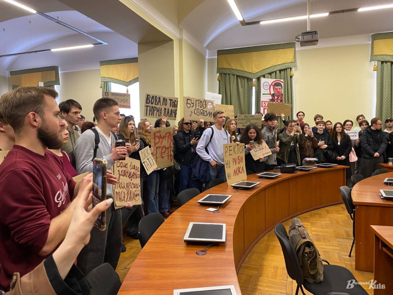 Контекст: Офіційний сайт Студентського парламенту Київського національного університету зазначає, що 20 березня в одному анонімному Telegram-каналі оприлюднили відео інтимного характеру, на якому нібито зафіксовано чоловіка, схожого на ректора Володимира Бугрова. Згодом представники студентського самоврядування повідомили, що впродовж майже тижня після офіційного звернення до адміністрації не отримали відповіді на поставлені запитання. Після цього, вони оголосили акцію протесту.
