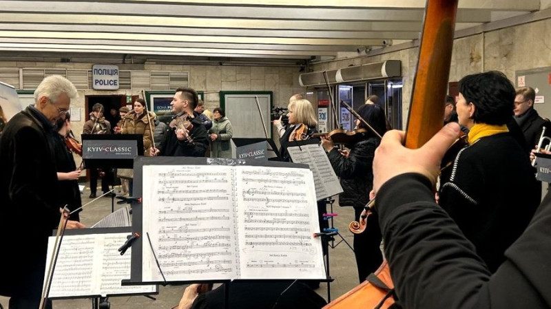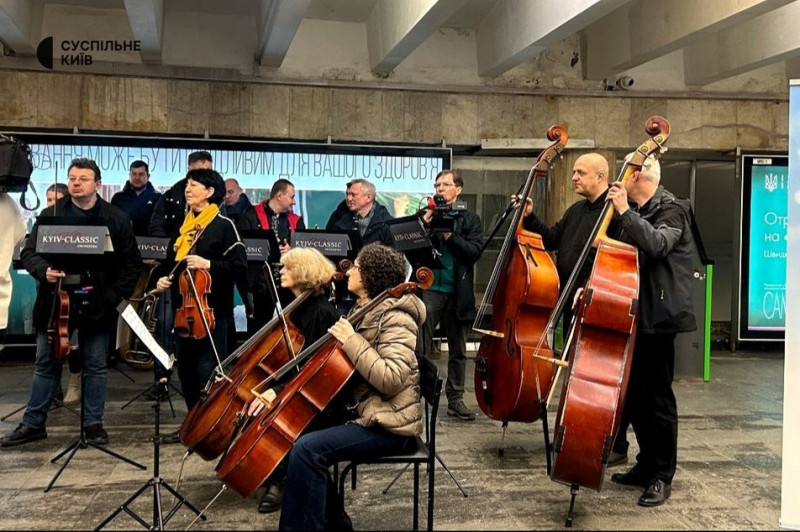 Сьогодні, 9 березня, у Києві біля станції метро "Майдан Незалежності" відбулася мистецька акція "Гімн Незламності України 2022-2026". У заході брали участь музиканти оркестру "Київ-Класик".