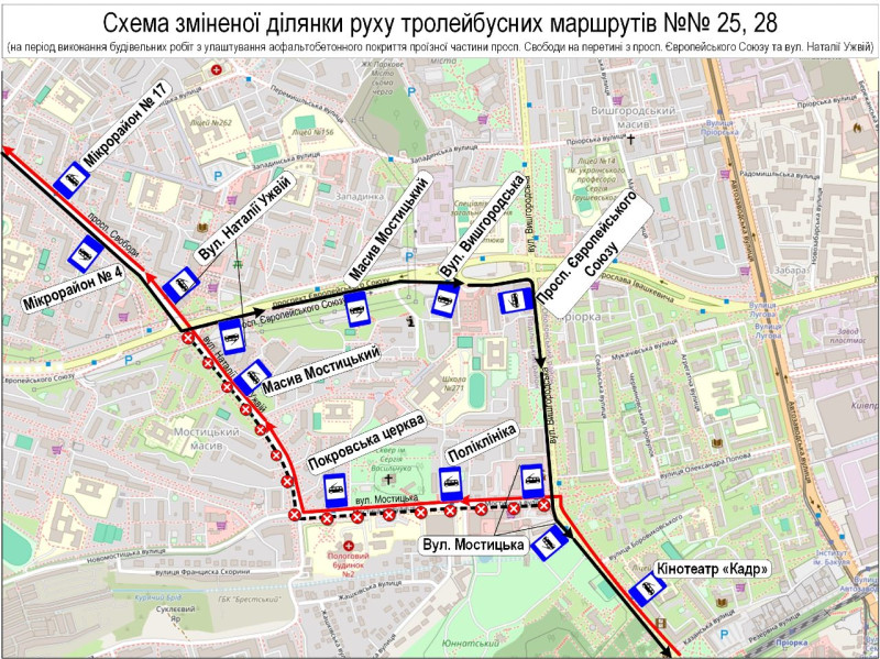 Так, з 6 до 10 квітня тролейбуси №№ 25, 28 курсуватимуть зі змінами руху. На проспекті Свободи ремонтуватимуть дорогу. Як повідомили у Київпастрансі, йдеться про ділянку на перетині з просп. Європейського Союзу та вул. Наталії Ужвій.