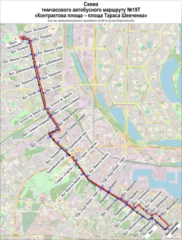 - автобус № 19-Т — від вул. Спаська — вул. Межигірська — вул. Щекавицька — вул. Костянтинівська — вул. Оленівська — вул. Кирилівська — вул. Сирецька — вул. Семена Скляренка — вул. Автозаводська — вул. Полярна до площі Тараса Шевченка; у зворотному напрямку — вул. Полярна — вул. Автозаводська — вул. Семена Скляренка — вул. Сирецька — вул. Кирилівська — вул. Щекавицька — вул. Костянтинівська — вул. Спаська до Контрактової площі.