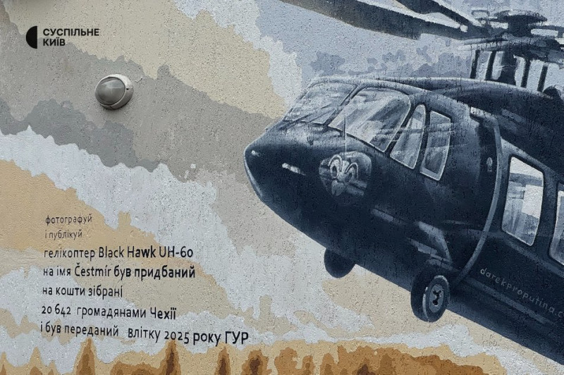 Мурал присвячений гелікоптеру UH-60 Black Hawk, який отримало ГУР в межах ініціативи “Подарунок для Путіна”. Суспільне Новини/Нікіта Галка