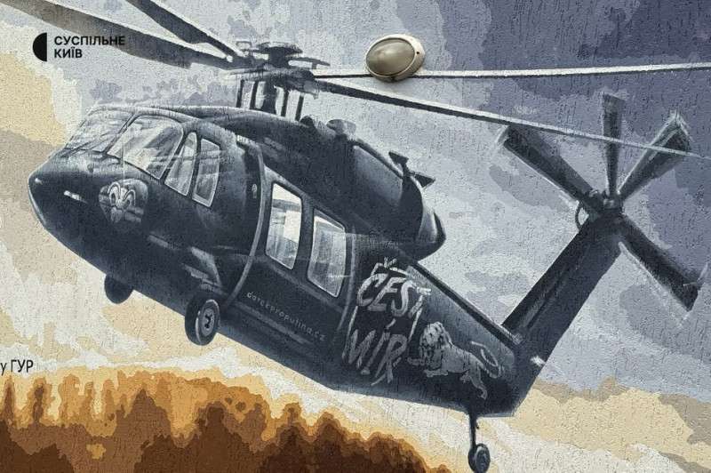 Мурал присвячений гелікоптеру UH-60 Black Hawk, який отримало ГУР в межах ініціативи “Подарунок для Путіна”. Суспільне Новини
