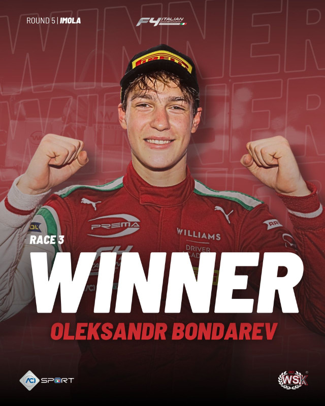 Український гонщик вперше в історії здобув перемогу на перегонах Формули. 16-річний Олександр Бондарев виграв перегони в межах п’ятого етапу італійської «Формули-4». Змагання відбулися сьогодні, 3 серпня в місті Імола.